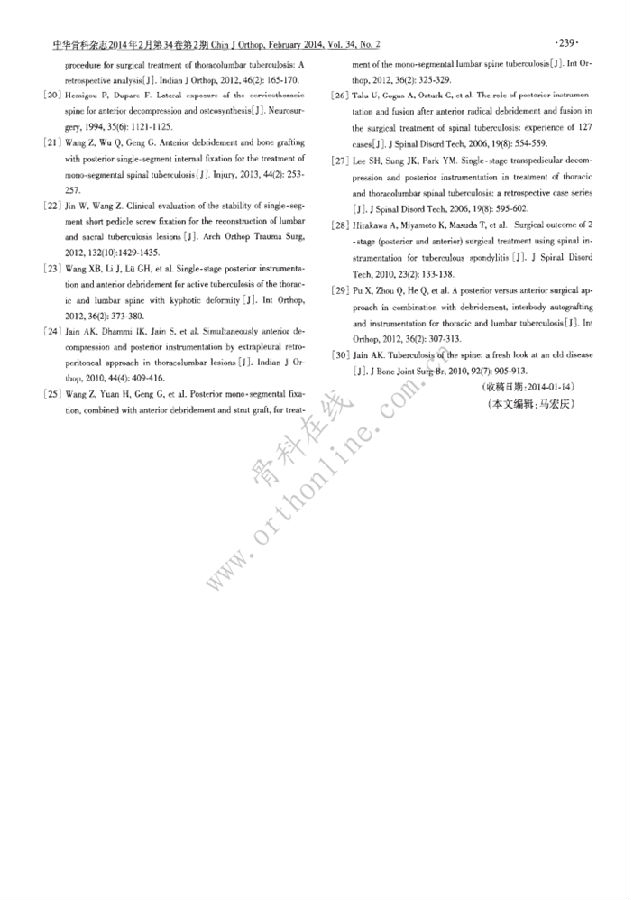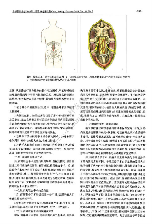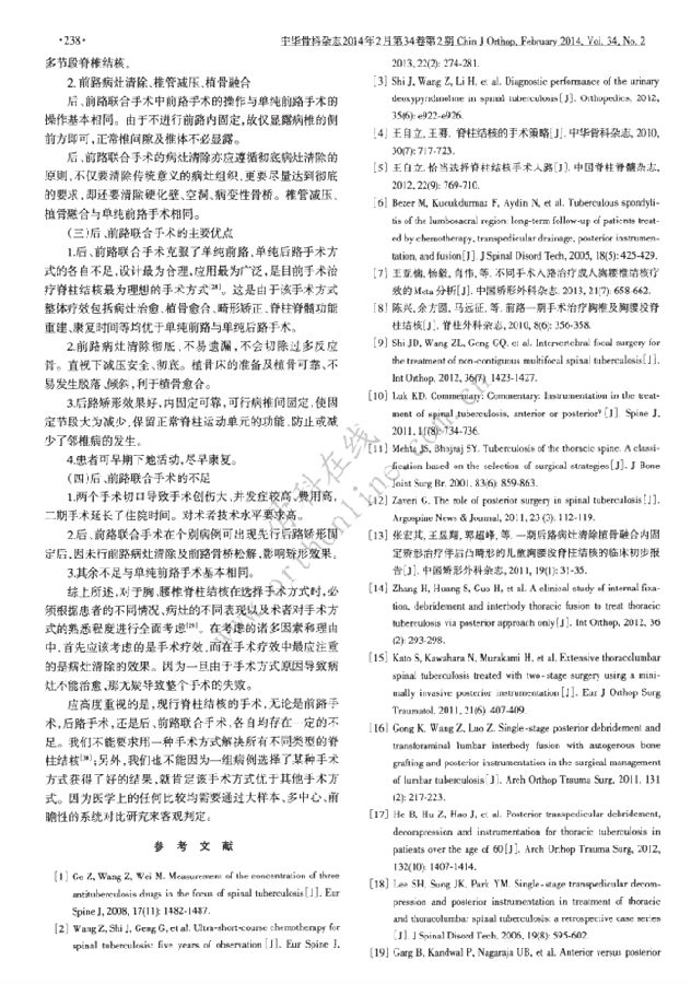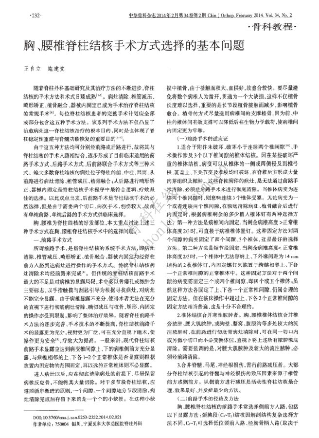 随着脊柱外科基础研究及其治疗方法的不断进步,脊柱结核的手术方法和术式日臻成熟.病灶清除、椎管减压、畸形矫正、植骨融合、器械内固定已成为手术治疗脊柱结核的常规手术.每位脊柱结核患者的完整手术计划应全部或部分包含这五种手术方法.该系列手术方法不仅凸显了治愈病灶这一脊柱结核治疗的根本目的,同时是也体现了脊柱稳定性重建与脊髓功能恢复的重要目的
