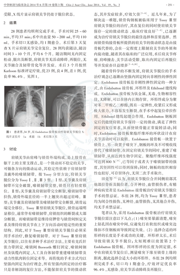 结果:28 例患者均顺利完成手术,手术时间25 ~60 min,平均37 min。术后3 周复查X 片示肩锁关节完全复位。28 例均获随访,随访时间3~10 个月,平均6 个月。随访期间无内固定松动、脱出及断裂,肩锁关节无活动障碍、再脱位,无关节融合及韧带骨化等并发症。按照Karlsson 标准评定疗效,优23 例,良4 例,差1 例,优良率96%。