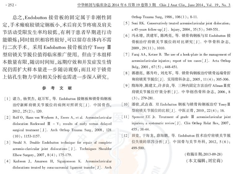 结论:Endobutton 接骨板治疗肩锁关节功能恢复快,临床疗效满意,值得推广。
