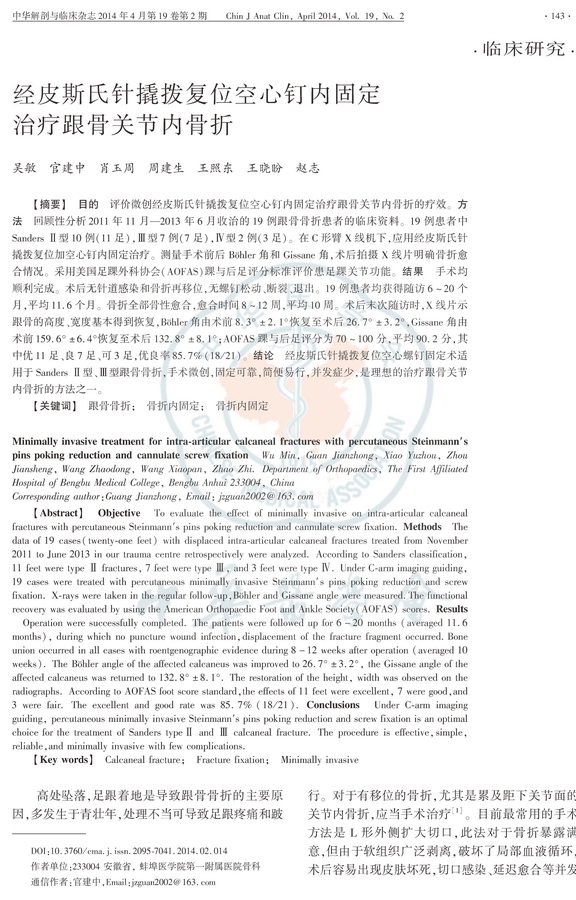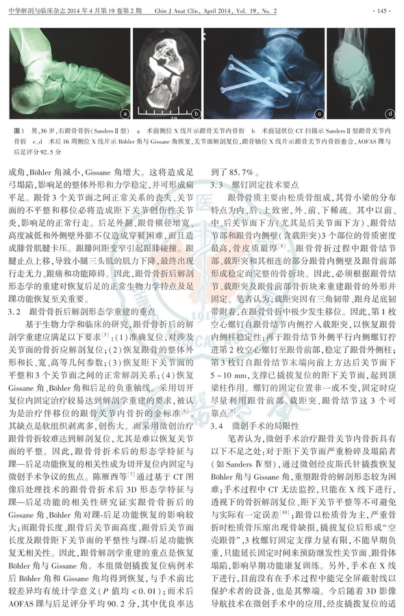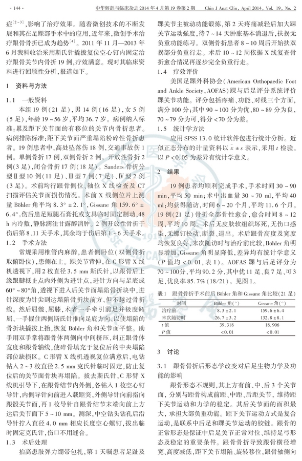 结果:手术均顺利完成。术后无针道感染和骨折再移位,无螺钉松动、断裂、退出。19例患者均获得随访6~20个月,平均11.6个月。骨折全部骨性愈合,愈合时间8~12周,平均10周。术后末次随访时,X线片示跟骨的高度、宽度基本得到恢复,Böhler角由术前8.3°±2.1°恢复至术后26.7°±3.2°,Gissane角由术前159.6°±6.4°恢复至术后132.8°±8.1°;AOFAS踝与后足评分为70~100分,平均90.2分,其中优11足、良7足、可3足,优良率85.7%(18/21)。