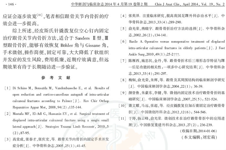 结论:经皮斯氏针撬拨复位空心螺钉固定术适用于Sanders Ⅱ型、Ⅲ型跟骨骨折,手术微创,固定可靠,简便易行,并发症少,是理想的治疗跟骨关节内骨折的方法之一。