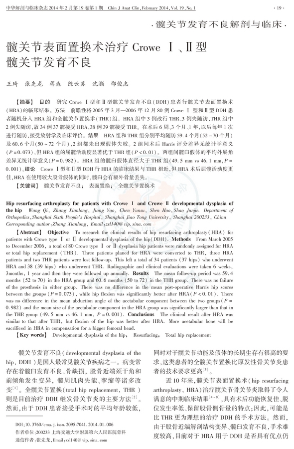 目的:研究Crowe Ⅰ型和Ⅱ型髋关节发育不良(DDH)患者行髋关节表面置换术(HRA)的临床结果。
