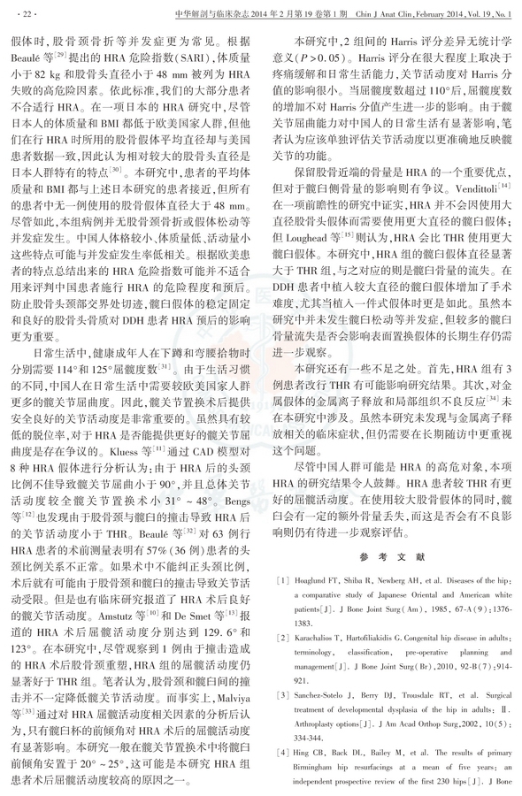 结论:Crowe Ⅰ型和Ⅱ型DDH行HRA的临床结果与THR相近,但HRA术后屈髋活动度更佳,HRA在使用较大股骨假体的同时,髋臼会有额外骨量丢失。