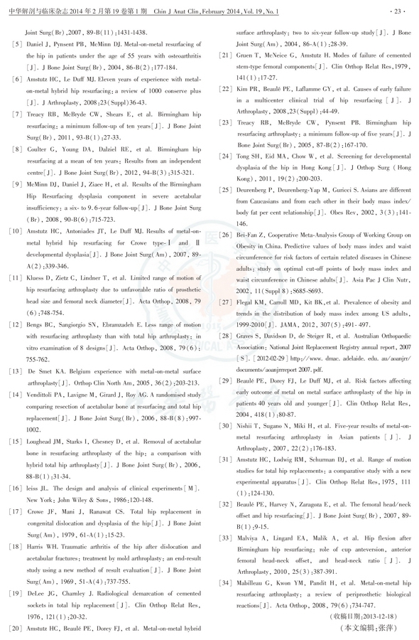 方法:前瞻性将2005年3月—2006年12月80例Crowe Ⅰ 型和Ⅱ型DDH患者随机分入HRA组和全髋关节置换术(THR)组。HRA组中3例改行THR、3例失随访,THR组中2例失随访,故34例37髋接受HRA,38例39髋接受THR。在术后6周、3个月、1年,以后每年1次进行随访,接受放射学及临床评价。