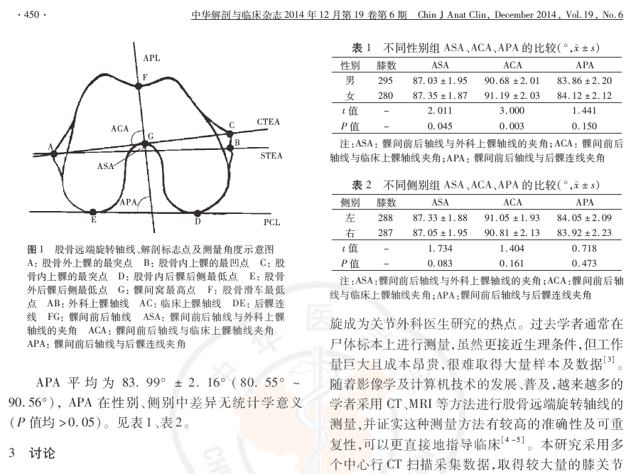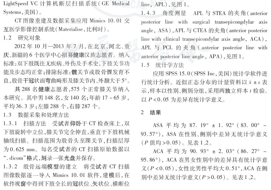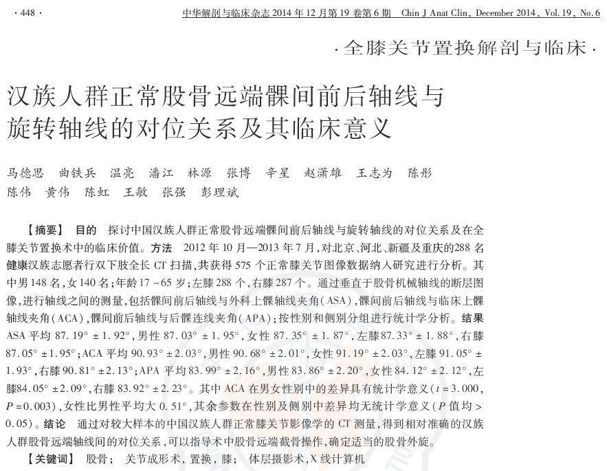 方法:2012年10月—2013年7月,对北京、河北、新疆及重庆的288名健康汉族志愿者行双下肢全长CT扫描,共获得575个正常膝关节图像数据纳入研究进行分析。其中男148名,女140名;年龄17~65岁;左膝288个,右膝287个。通过垂直于股骨机械轴线的断层图像,进行轴线之间的测量,包括髁间前后轴线与外科上髁轴线夹角(ASA),髁间前后轴线与临床上髁轴线夹角(ACA),髁间前后轴线与后髁连线夹角(APA);按性别和侧别分组进行统计学分析。