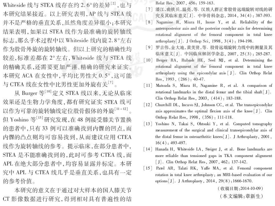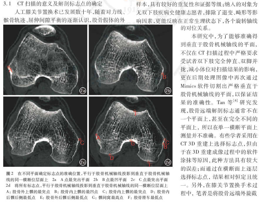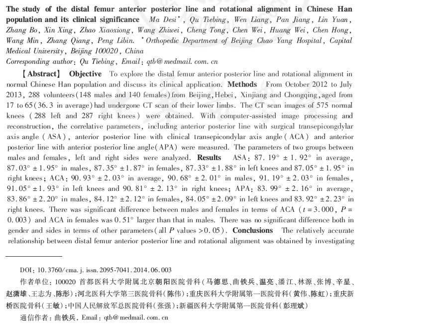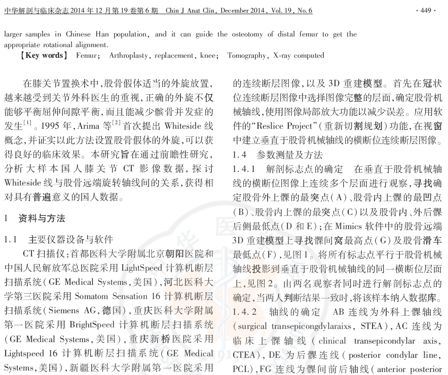 结论:通过对较大样本的中国汉族人群正常膝关节影像学的CT测量,得到相对准确的汉族人群股骨远端轴线间的对位关系,可以指导术中股骨远端截骨操作,确定适当的股骨外旋。