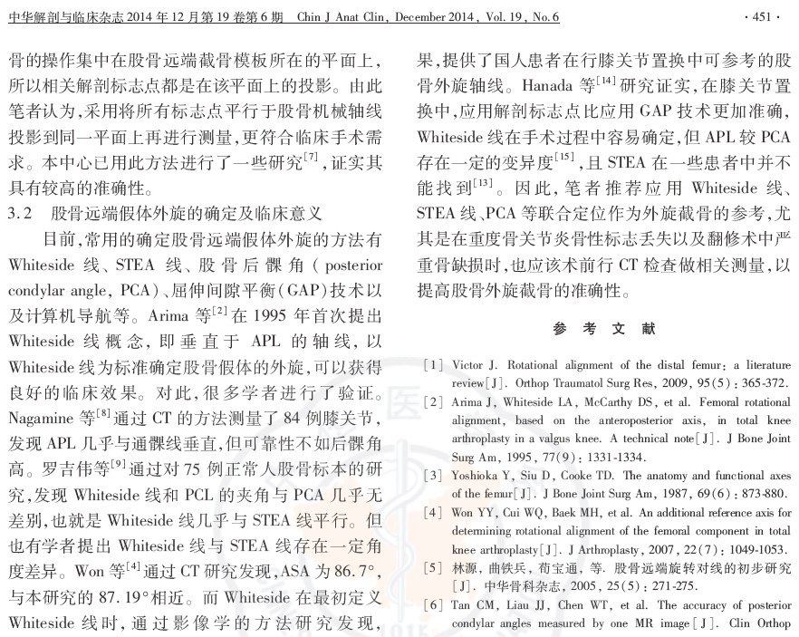 目的:探讨中国汉族人群正常股骨远端髁间前后轴线与旋转轴线的对位关系及在全膝关节置换术中的临床价值。