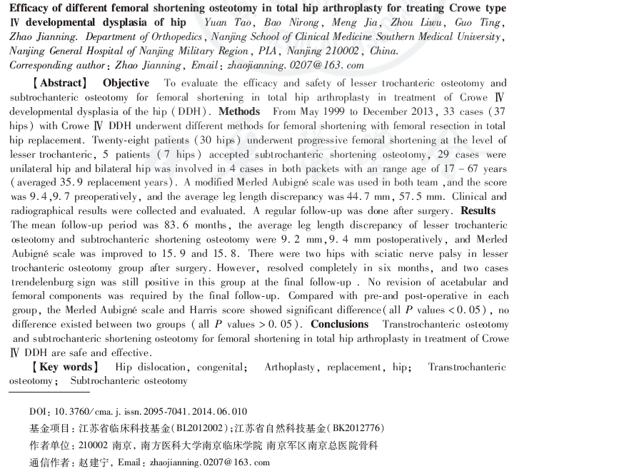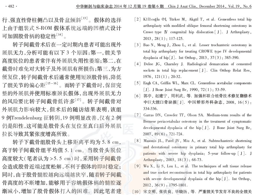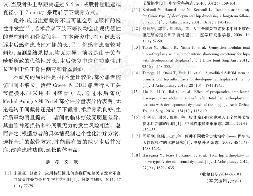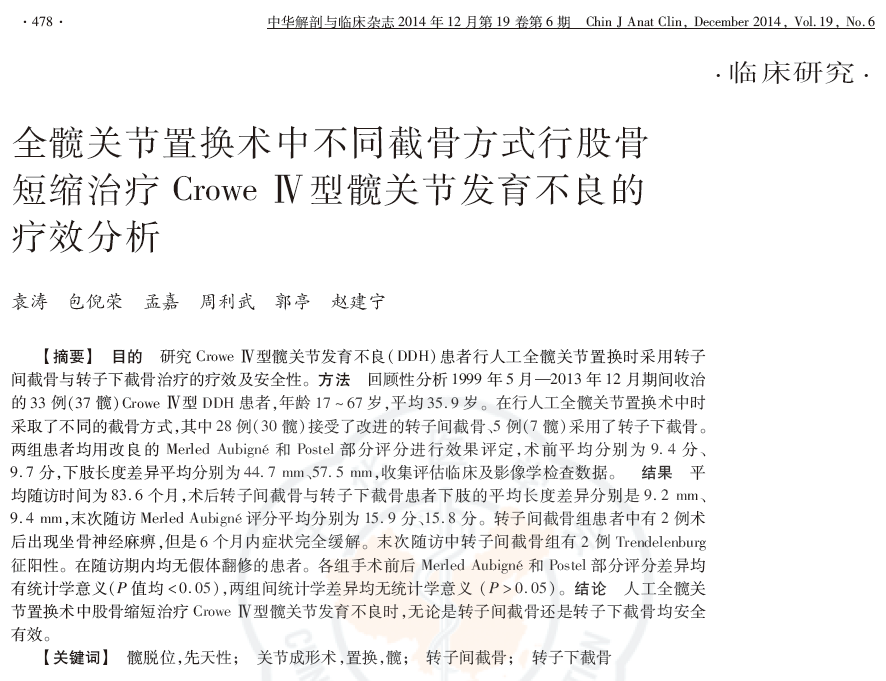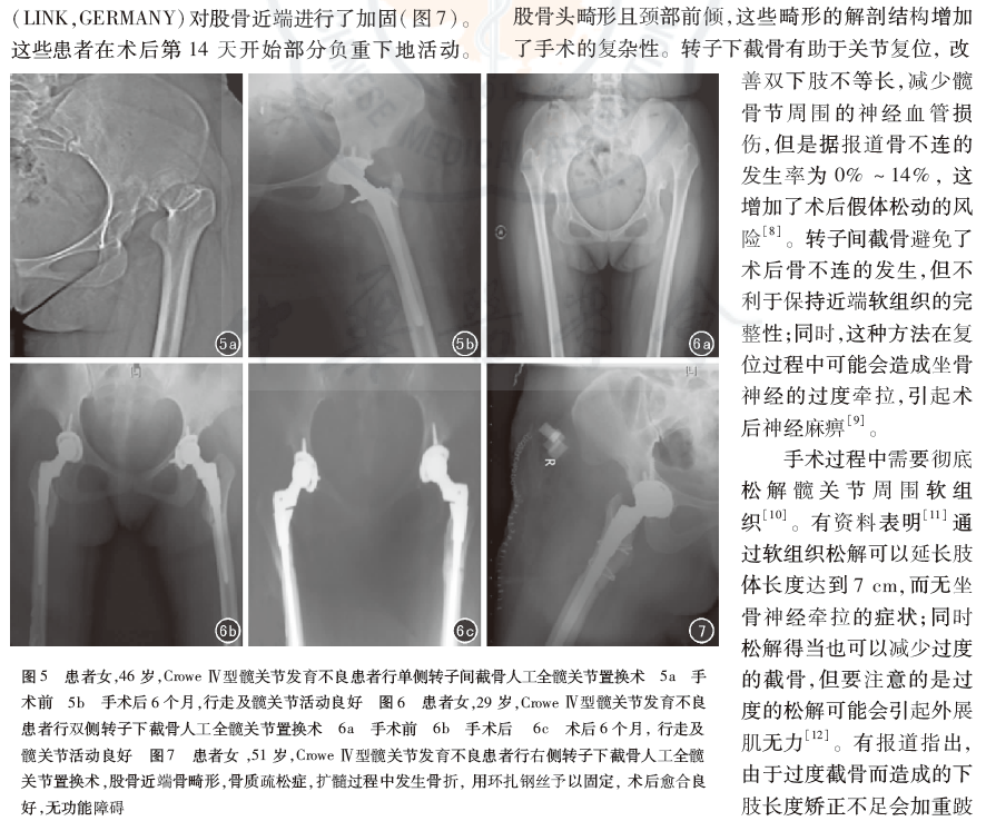 结论:人工全髋关节置换术中股骨缩短治疗Crowe Ⅳ型髋关节发育不良时,无论是转子间截骨还是转子下截骨均安全有效。