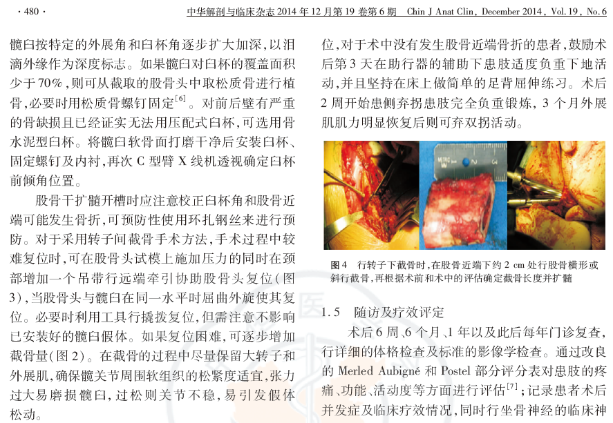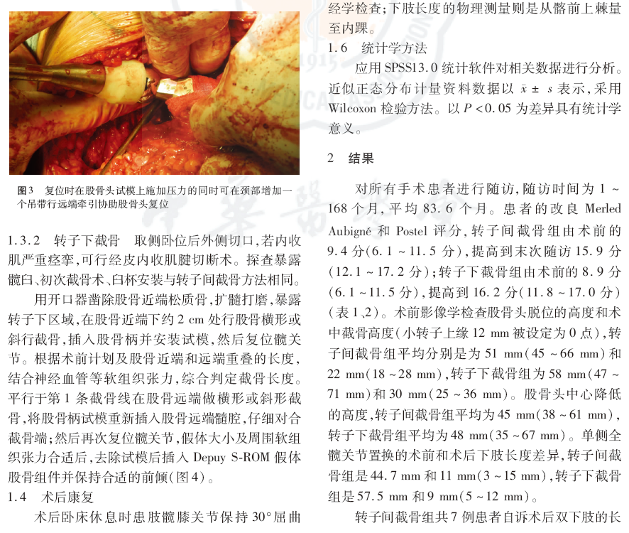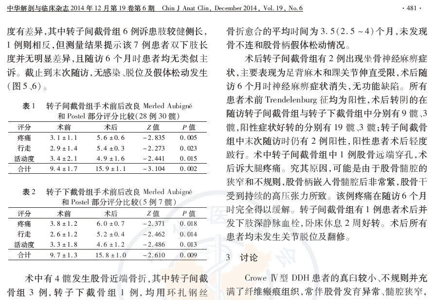 结果:平均随访时间为83.6个月,术后转子间截骨与转子下截骨患者下肢的平均长度差异分别是9.2 mm、9.4 mm,末次随访Merled Aubigné评分平均分别为15.9分、15.8分。转子间截骨组患者中有2例术后出现坐骨神经麻痹,但是6个月内症状完全缓解。末次随访中转子间截骨组有2例Trendelenburg征阳性。在随访期内均无假体翻修的患者。各组手术前后Merled Aubigné和Postel部分评分差异均有统计学意义(P值均<0.05),两组间统计学差异均无统计学意义 (P>0.05)。