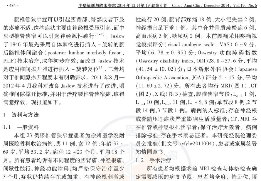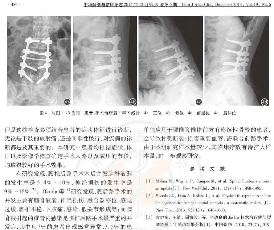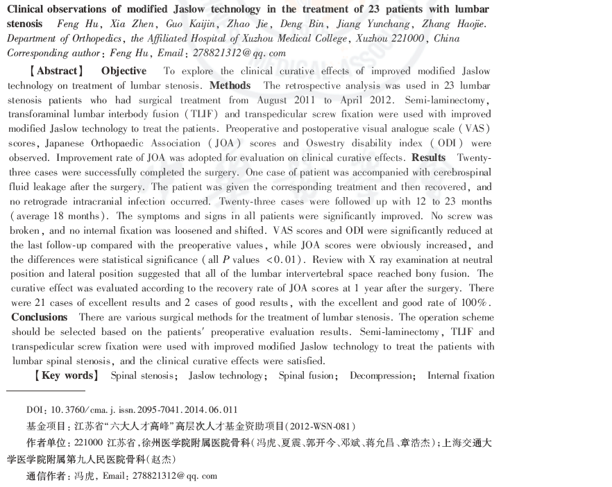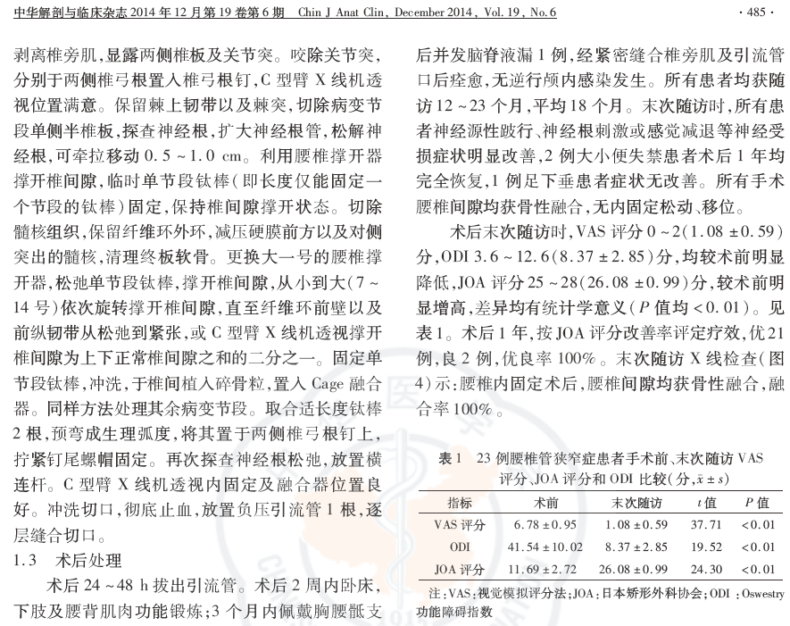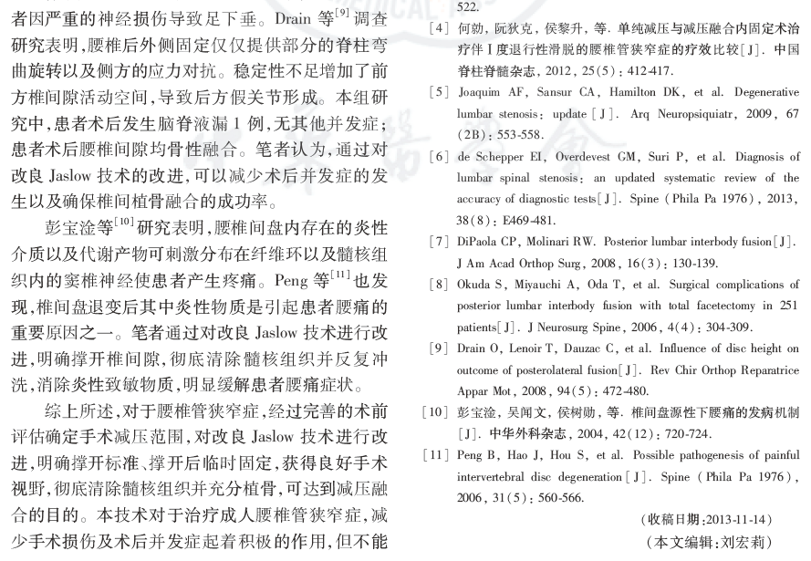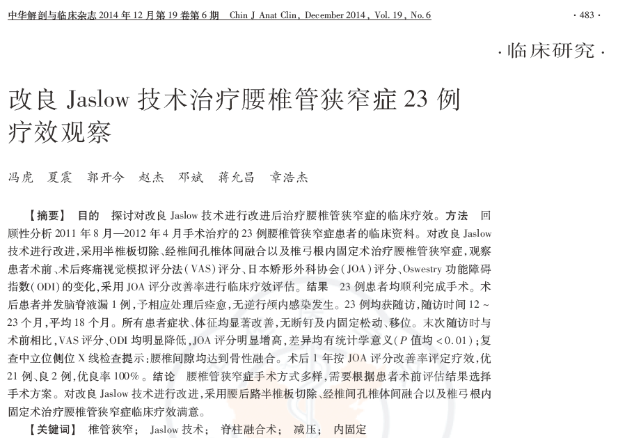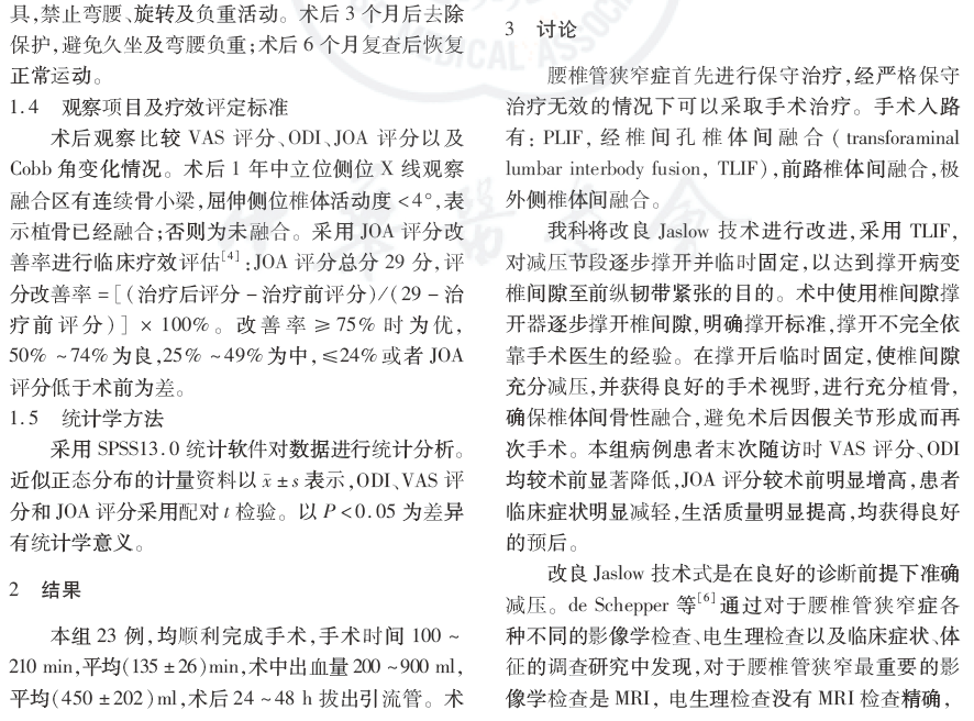 结论:腰椎管狭窄症手术方式多样,需要根据患者术前评估结果选择手术方案。对改良Jaslow技术进行改进,采用腰后路半椎板切除、经椎间孔椎体间融合以及椎弓根内固定术治疗腰椎管狭窄症临床疗效满意。