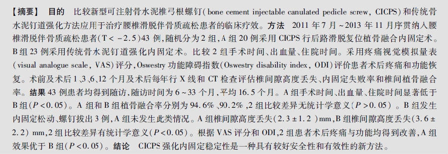 新型可注射骨水泥椎弓根螺钉与骨水泥钉道强化在治疗腰椎滑脱伴骨质疏松中的比较研究