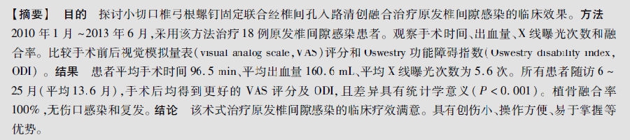 小切口固定联合椎间孔入路清创融合治疗原发椎间隙感染