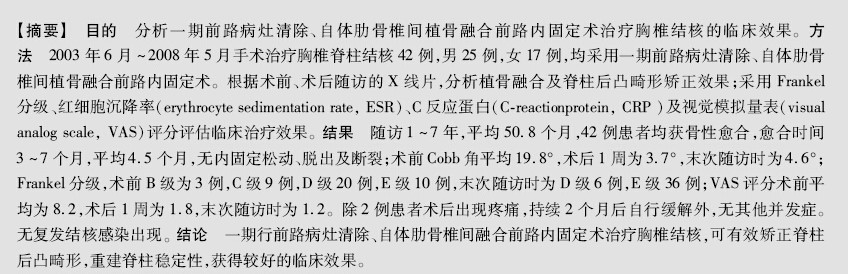 一期前路病灶清除联合自体肋骨植骨融合内固定治疗胸椎结核