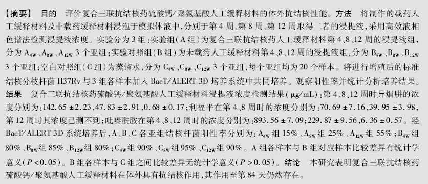 复合三联抗结核药人工缓释材料体外抗结核性能