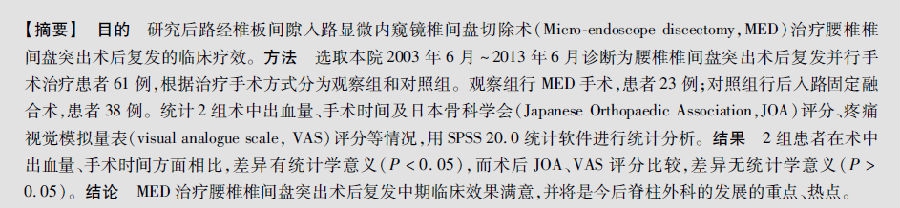 显微内窥镜椎间盘切除术治疗腰椎椎间盘突出术后复发
