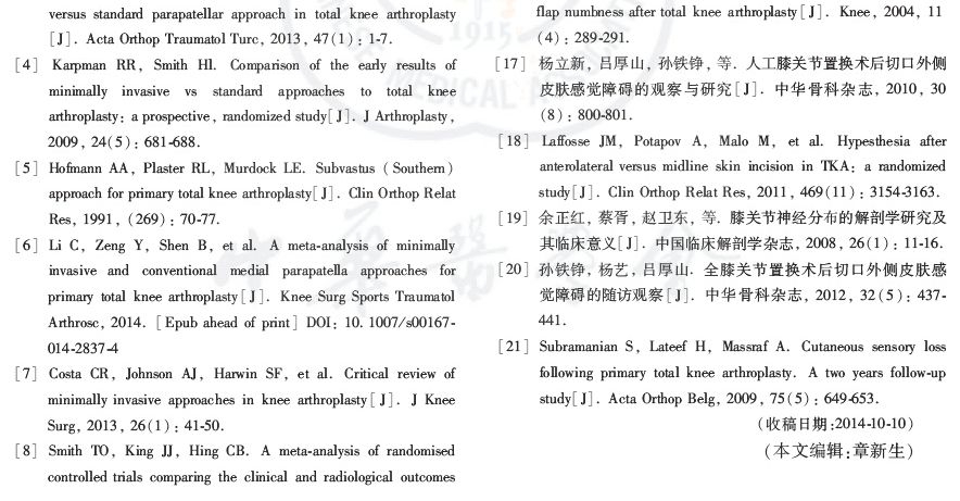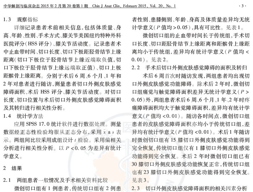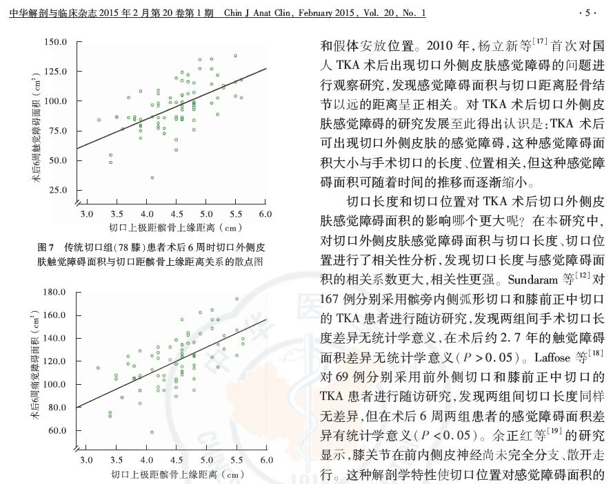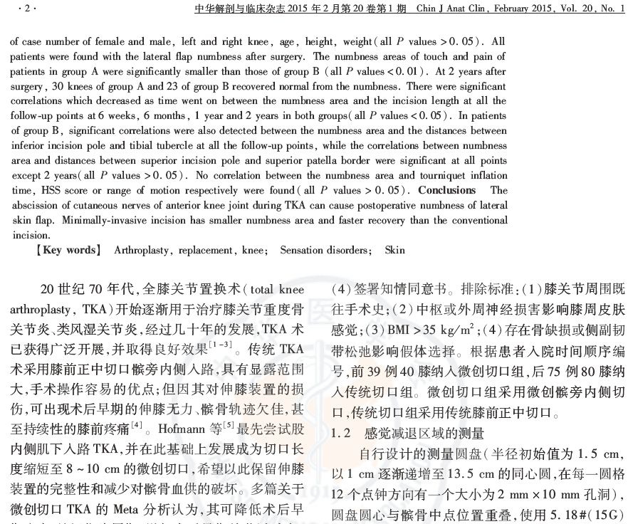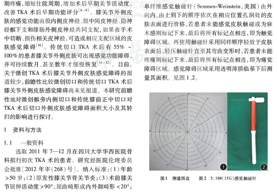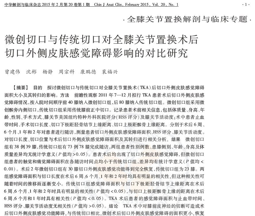 目的:探讨微创切口与传统切口对全膝关节置换术(TKA)后切口外侧皮肤感觉障碍面积大小及其转归的影响。