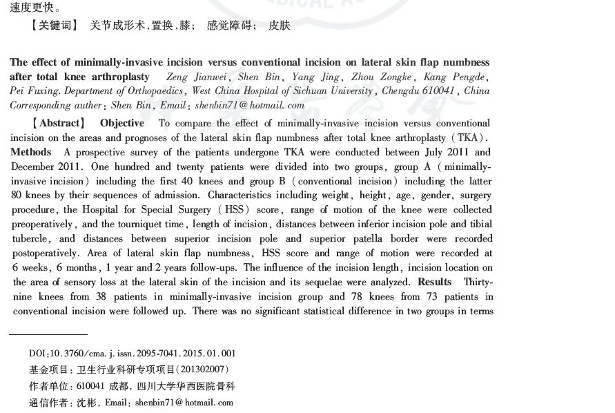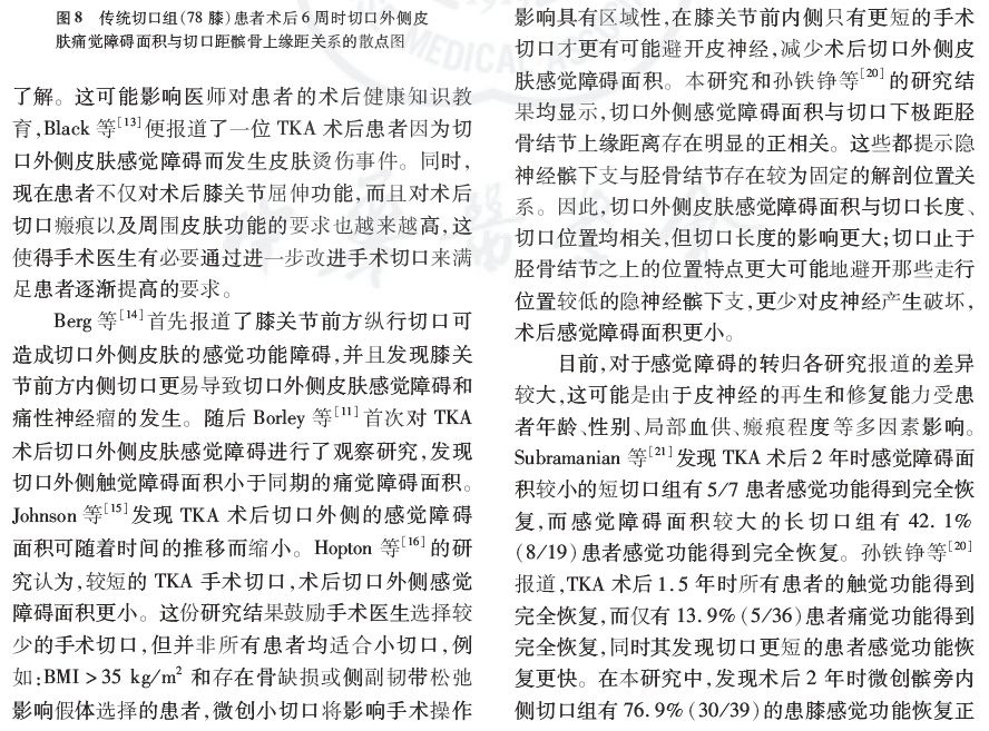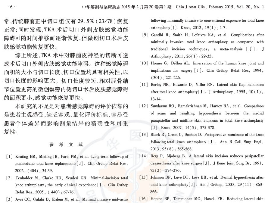 结论:TKA术中对膝前皮神经的切断可造成术后切口外侧皮肤感觉功能障碍,与传统切口相比,微创术后切口外侧皮肤感觉障碍的面积更小,恢复速度更快。
