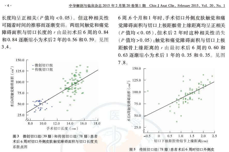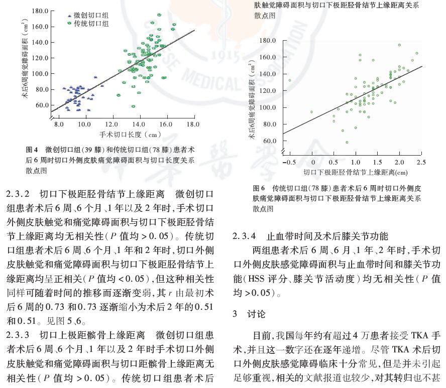 结果:微创切口组有38例39膝,传统切口组有73例78膝完成随访,两组患者性别例数、患膝侧别、年龄、身高及体质量差异均无统计学意义(P值均>0.05)。患者术后均出现了切口外侧皮肤感觉障碍,但微创切口组患者的触觉和痛觉障碍面积在各随访时间点均小于传统切口组,差异均有统计学意义(P值均<0.01)。术后2年微创切口组有30膝切口外侧皮肤感觉功能得到完全恢复,传统切口组为23膝。两组感觉障碍面积与切口长度在术后6周、6个月、1年和2年时均具有明显的相关性,但这种相关性可随着时间的推移而逐渐变小。传统切口组感觉障碍面积与切口下极距胫骨结节上缘距离在术后6周、6个月、1年和2年时具有明显的相关性(P值均<0.05),与切口上极距髌骨上缘的距离在术后6周、6个月和1年时具有相关性(P值均<0.05)。TKA术后患者的感觉障碍面积与止血带时间、HSS评分、膝关节活动度无相关性(P值均>0.05)。