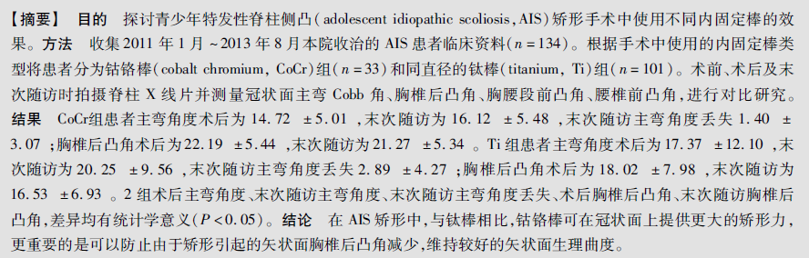 钴铬棒在青少年特发性脊柱侧凸矫形手术中的应用