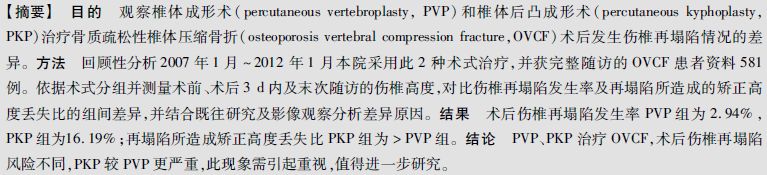 椎体成形术与椎体后凸成形术治疗骨质疏松性椎体压缩骨折术后伤椎再塌陷的对比研究