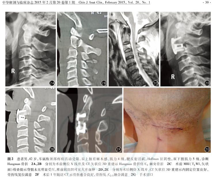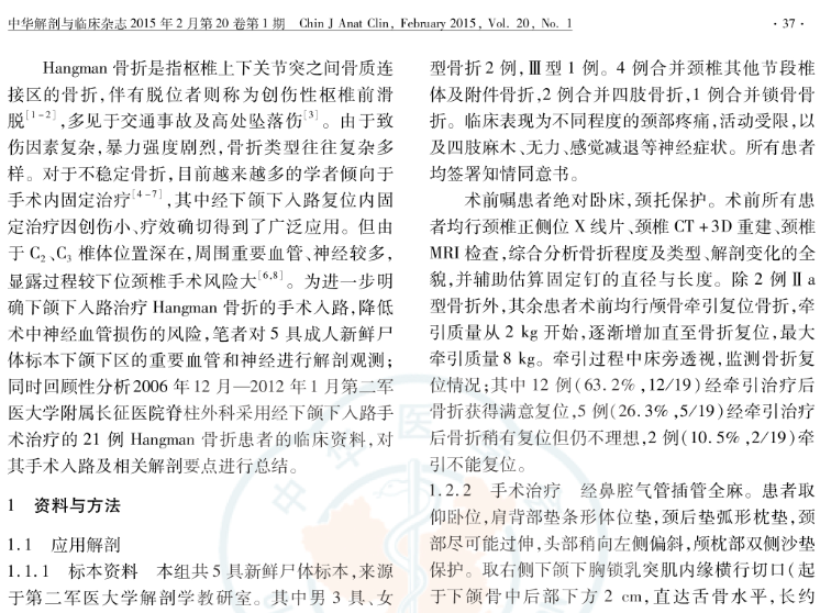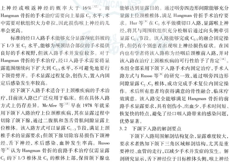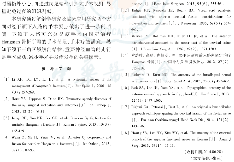结论:下颌下入路可充分显露手术内固定治疗Hangman骨折所需的手术节段,手术疗效满意。熟知下颌下三角区域解剖结构、重要神经血管的走行是手术成功、减少手术并发症发生的关键因素。