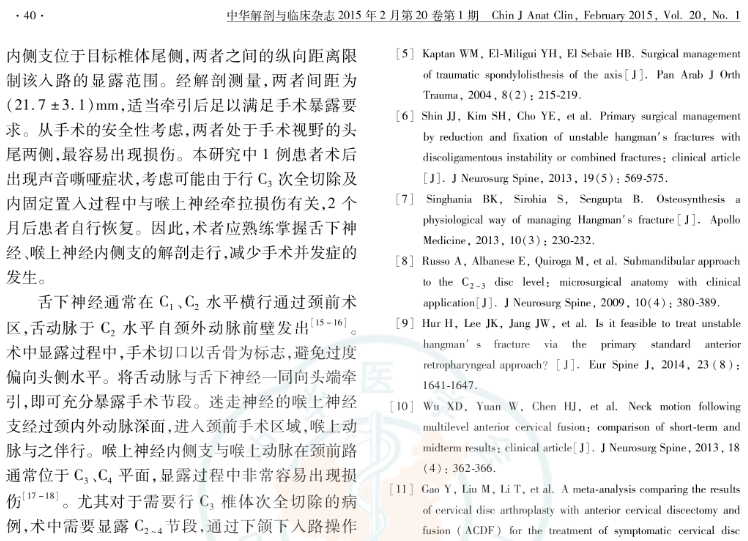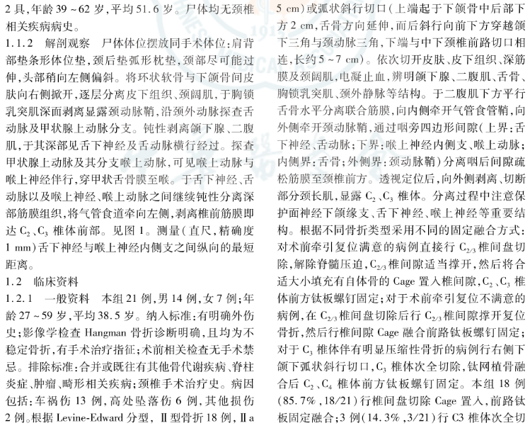方法:对5具成人新鲜尸体标本下颌下区的重要血管和神经进行解剖观察,并测量舌下神经与喉上神经内侧支之间纵向的最短距离;其中男3具、女2具,年龄39~62岁,均排除颈椎相关疾病病史。回顾分析2006年12月—2012年1月第二军医大学附属长征医院脊柱外科采用下颌下入路手术治疗21例Hangman骨折患者的临床资料,其中男14例、女7例,年龄27~59岁;根据Levine-Edward分型,Ⅱ型骨折18例,Ⅱa型骨折2例,Ⅲ型1例。