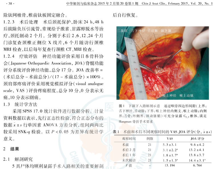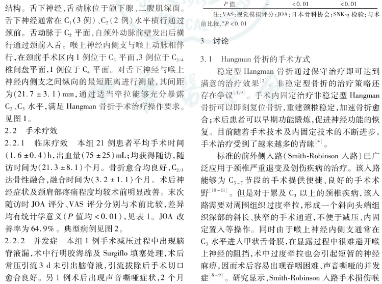 结果:下颌下入路的相关重要解剖结构在尸体解剖中得以充分显露,舌下神经与喉上神经内侧支之间纵向的最短距离为(21.7±3.1)mm,通过适当牵拉能够充分暴露C2、C3水平,满足Hangman骨折手术治疗操作要求。21例临床病例随访(21.3±8.1)个月,骨折愈合均良好,术后神经症状及颈肩部疼痛程度均较术前明显改善,JOA 改善率为64.9%。1例术中减压过程中出现脑脊液漏,术中行明胶海绵及Surgiflo填塞处理,术后常压引流3 d未引出脑脊液,引流拔除后手术切口愈合良好;1例术后出现声音嘶哑症状,2个月后自行恢复。