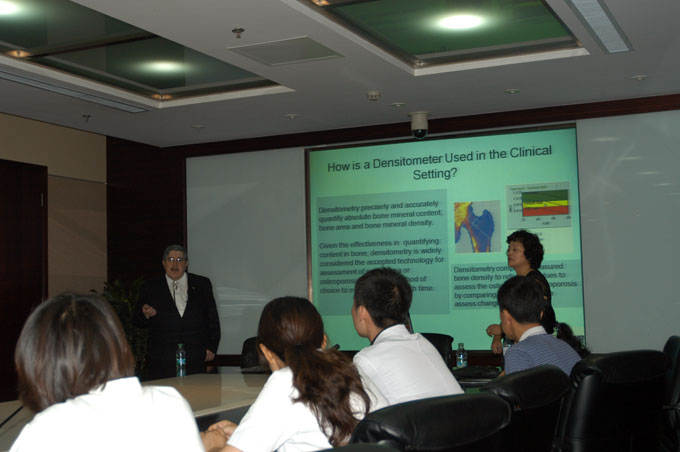 TOM先生的讲座十分生动,内容从骨密度测量的背景知识一直到骨密度的最新诊断理念,精彩的演讲非常精彩,博得了与会者的阵阵掌声。其间,TOM先生还亲自现场指导医技人员给病人进行了骨密度的检查,包括骨龄的测量、前臂骨皮质密度的测量、股骨头置换术后的骨密度测量、脂肪含量的测量等等,并和临床科室的医生展开了热烈的讨论。这些都对今后天津市第一中心医院深入开展骨密度测量的临床应用起到了巨大的推动作用。