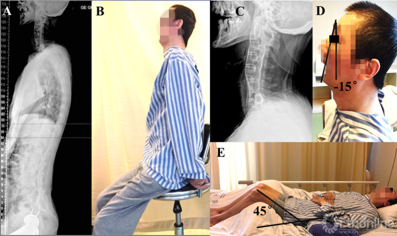 患者男性,45岁,因“强直性脊柱炎30余年,不能平视2年”入院。患者30多年于当地医院诊断为“强直性脊柱炎”,18年前因双侧髋、膝关节强直行走不便开始长期卧床。2年前于浙江大学第二附属医院行“双侧髋关节置换”,术后能坐立,但不能站立和平视。2年来自觉生活不能自理,遂就诊于浙江大学第二附属医院脊柱外科,门诊以“强直性脊柱炎伴颈椎伸展畸形”收入院。