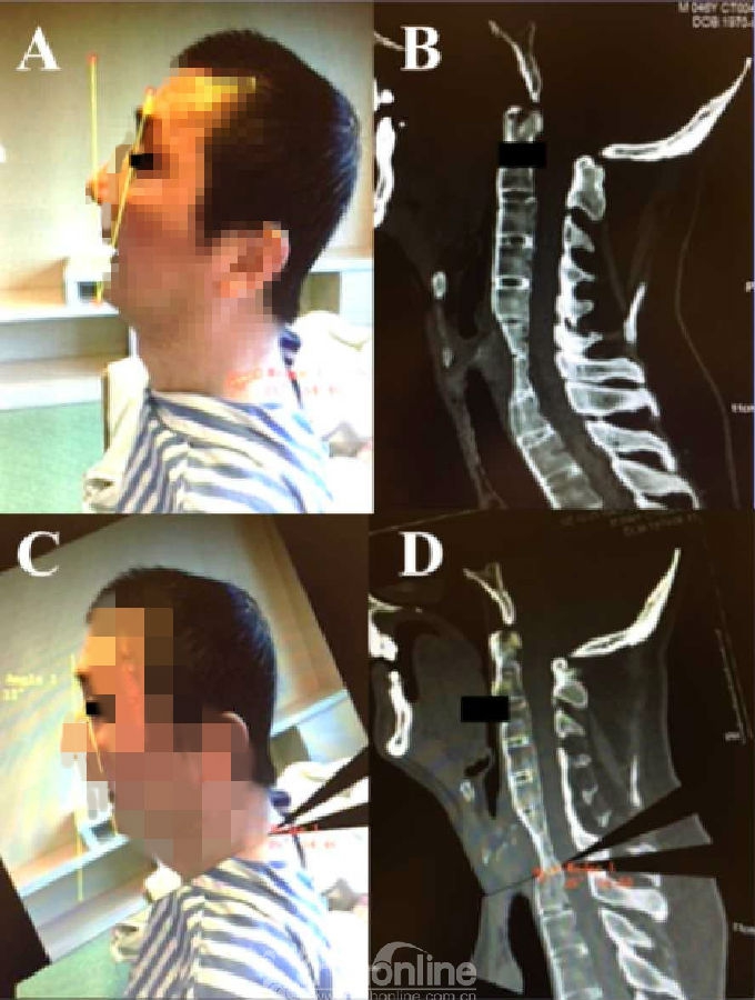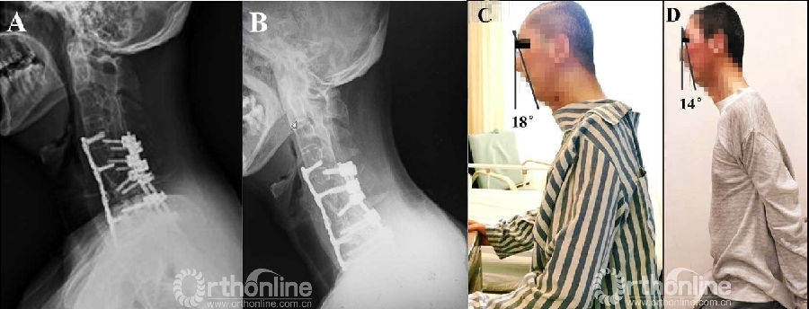 图5 图A和B示颈椎术后和术后3月颈椎骨性愈合良好;图C和D显示术后及术后3月CBVA分别为向下18°和14°,提示平视功能显著改善。