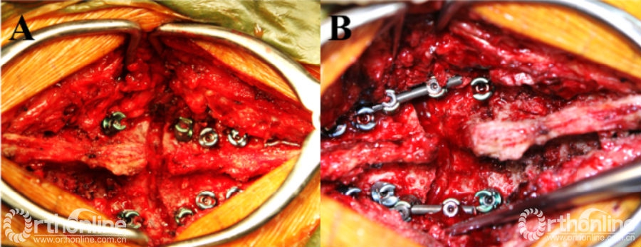 图3 图A示C7-T1后路横行截骨、置钉,图B示连接棒不锁紧用以临时支撑。