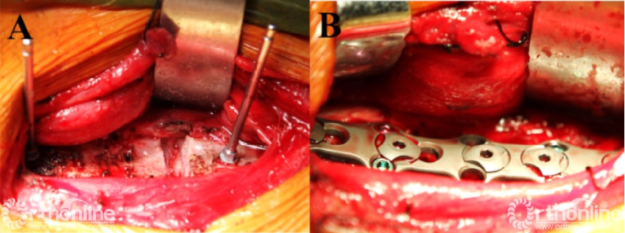图4 图A示C7-T1前路闭合楔形截骨,图B示颈椎前路内固定。