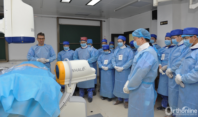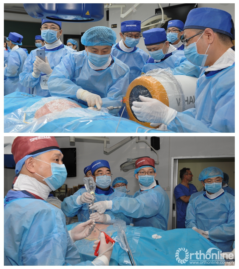 中山大学附属第三医院戎利民教授、董健文教授,谢沛根教授,德国慕尼黑ISAR医院Dr.Stefan Hellinger教授,台湾嘉义基督教医院的黄仪鸿教授,台湾彰化基督教医院的陈建民教授作为指导老师,为来自台湾、四川和广东的12名经皮脊柱内镜学员,亲自示范并详细介绍了经椎间孔入路和椎板间入路脊柱内镜的操作要点。