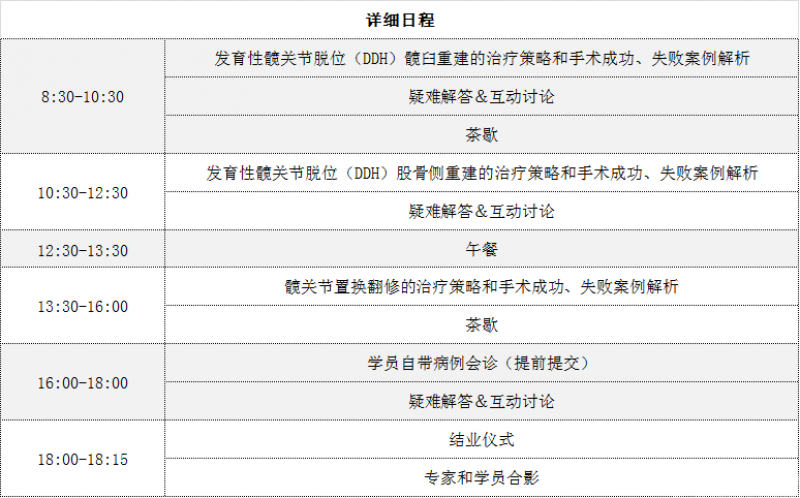 本次精品课程时长1天,以实战策略分析、手术视频解析和成功、失败的真实案例分享为授课主线,通过图文与视频结合、讲解与演示结合、理论与实践结合,对DDH重建和髋关节置换翻修3大临床常见问题进行细致分析和详尽讨论。学员可以汲取大师多年临床经验精华、直接获得临床常见手术秘籍、现场会诊自带疑难病例,真正实现面对面交流。课后建立师生联络群,可持续沟通交流。