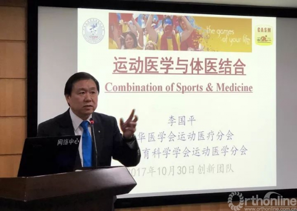 会上,中国体育科学学会运动医学分会主任委员李国平教授发表了《运动医学与体医结合》的主题演讲,他指出,体医结合离不开政府支持,需要进一步推动运动医学的全面深入和可持续发展。同时,要加强竞技体育、全民健身、全民健康结合;加强全面健身像全民健康方面深度融合;加强建立体医结合理论和方法标准体系研究。