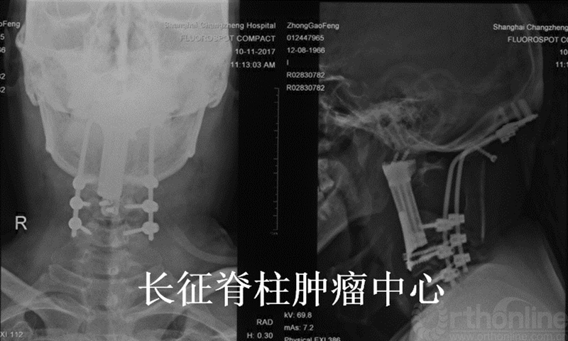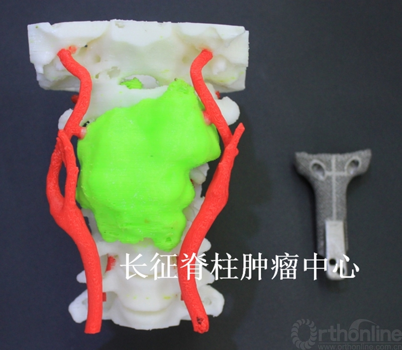 面对这一巨大的挑战,肖建如主任团队通过术前精准的1:1比例3D打印肿瘤模型,通过计算机辅助CT与MRI图像融合技术准确锁定了手术切除的范围和边界。然而,由于肿瘤累及颅底和上颈椎范围之广,现有的内固定器械无法满足手术切除后四个椎节前方缺损区的枕颈重建。