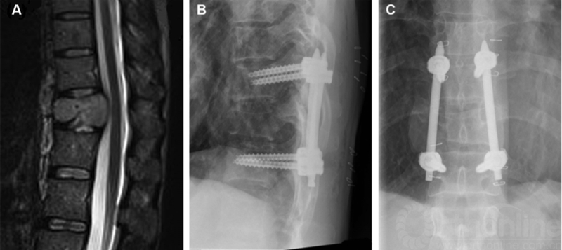 图1经皮椎弓根螺钉系统。A,T11黑色素瘤转移患者的MRI表现,多发性皮损,肝,肺,脑转移,表现为背痛。B,侧位X线片显示经皮椎弓根螺钉姑息性治疗疼痛。C,正位X线片。
