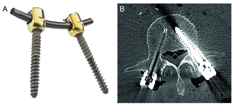图2碳纤维增强PEEK椎弓根螺钉。A,碳纤维螺丝,钛合金多轴头,碳纤维增强棒。B,CT横断面扫描,(图片右侧)病人体内左侧为钛椎弓根螺钉,右侧为碳纤维螺钉,伪影更少。改良自Icotec TM。