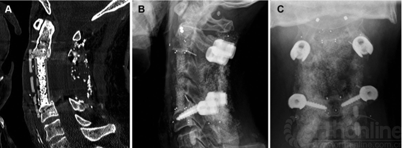 图3C3和C4椎体切除术,后路C2和C5碳纤维椎弓根螺钉固定,前路置入cage和钛板。射线有效穿透可以为后续的放疗提供更准确的剂量计划。A,矢状位CT扫描显示前方碳纤维板和锁定螺钉,融合器和植骨融合。B,侧位片显示植入物的放射透明度。可以看到C2螺钉的钛多轴头和标准钛C5螺钉。所有碳纤维成分在融合器的角落用小型不透射线标志物表示,螺丝尖端、标记钛板的前端和后棒的末端。C,正位X线片。