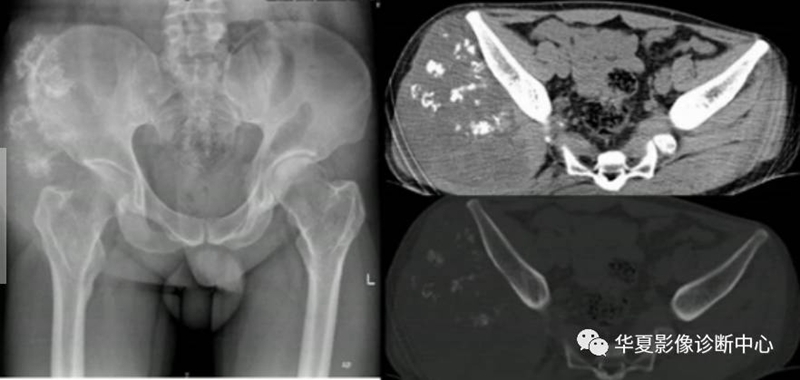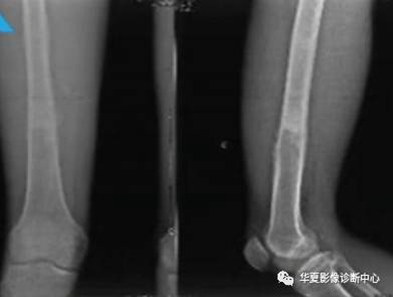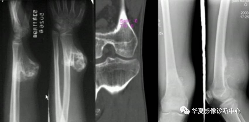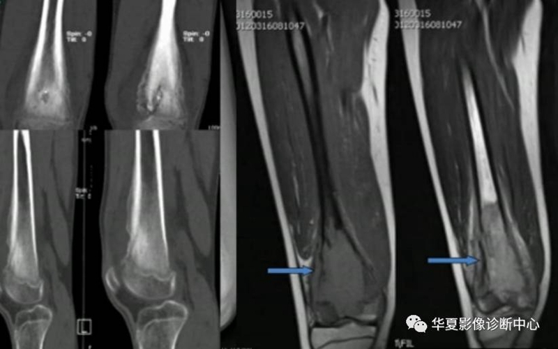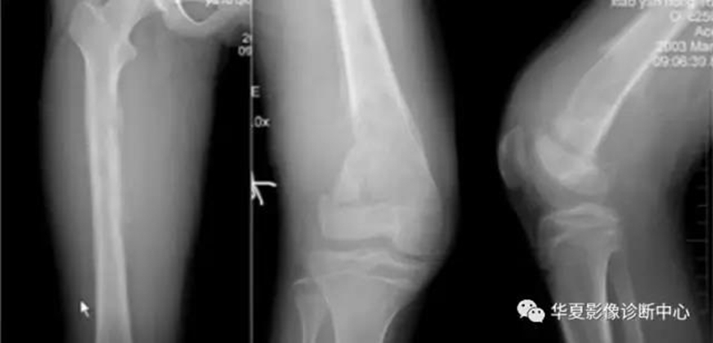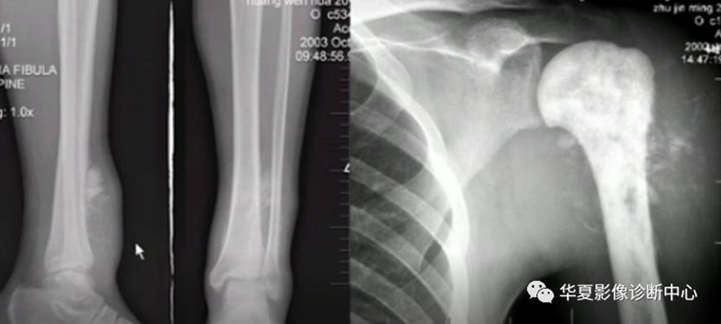 左为亚急性化脓性骨髓炎,右为骨肉瘤