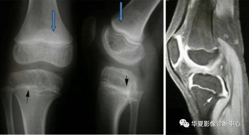股骨远端正常骨骺,侵犯骺板软骨:出现软组织且宽窄不一