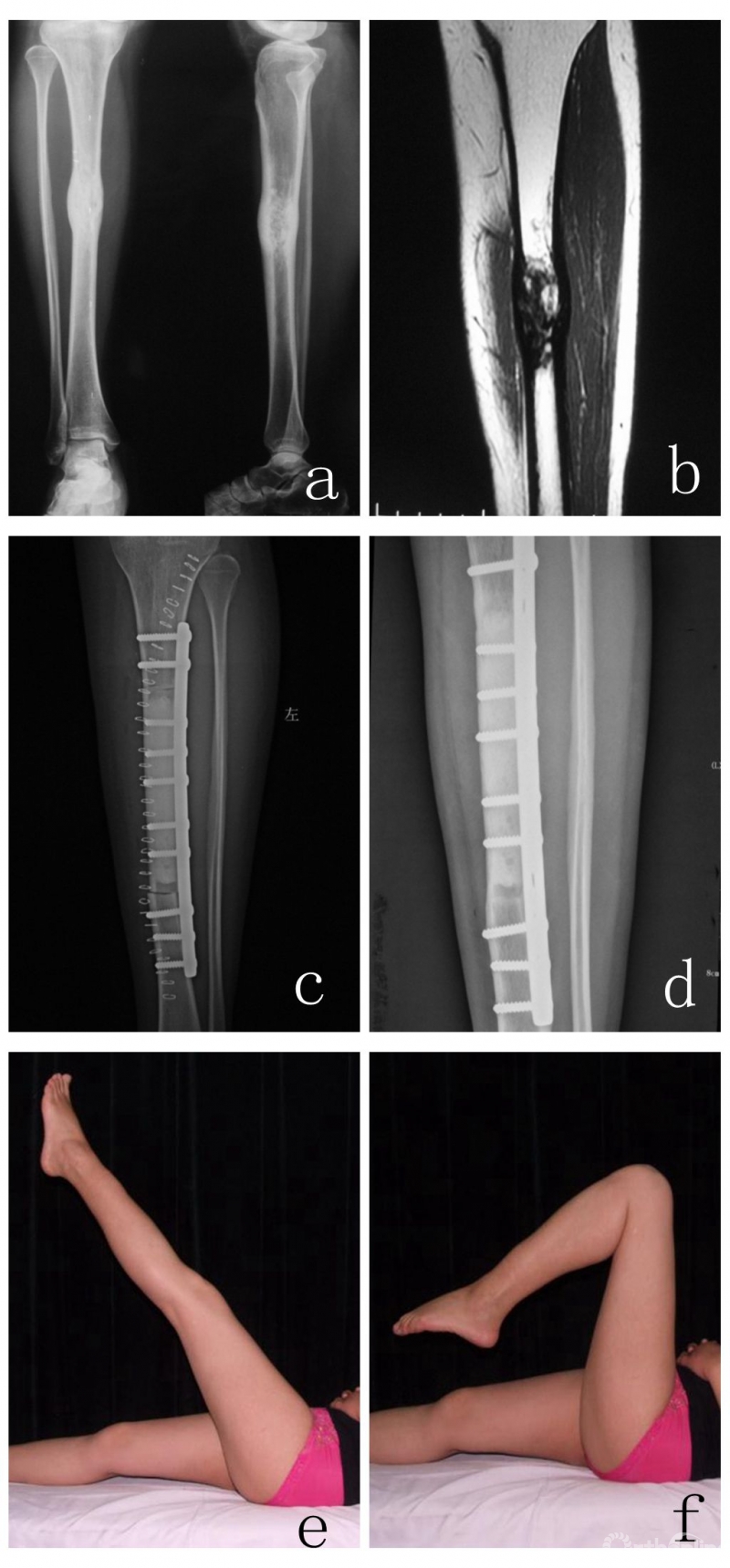 图2女,38岁,胫骨造釉细胞瘤,行瘤段截除大段异体骨重建。a 术前X线片,b,术前MRI,c, 术后X线片,d,术后4年半X线片,e,f,术后4年半功能相