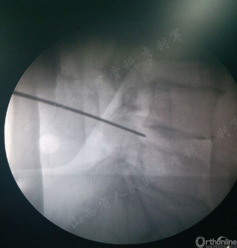 第一步:椎间孔穿刺,无需按标准靶点穿刺,只要穿刺针穿入椎间孔下半部分即可,只需要透视侧位片,不需要拍正位片,明显减少穿刺次数和透视次数。如图1