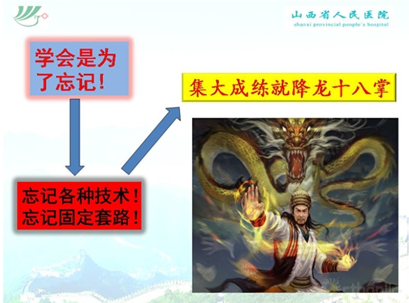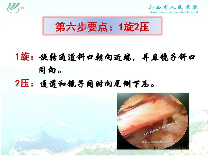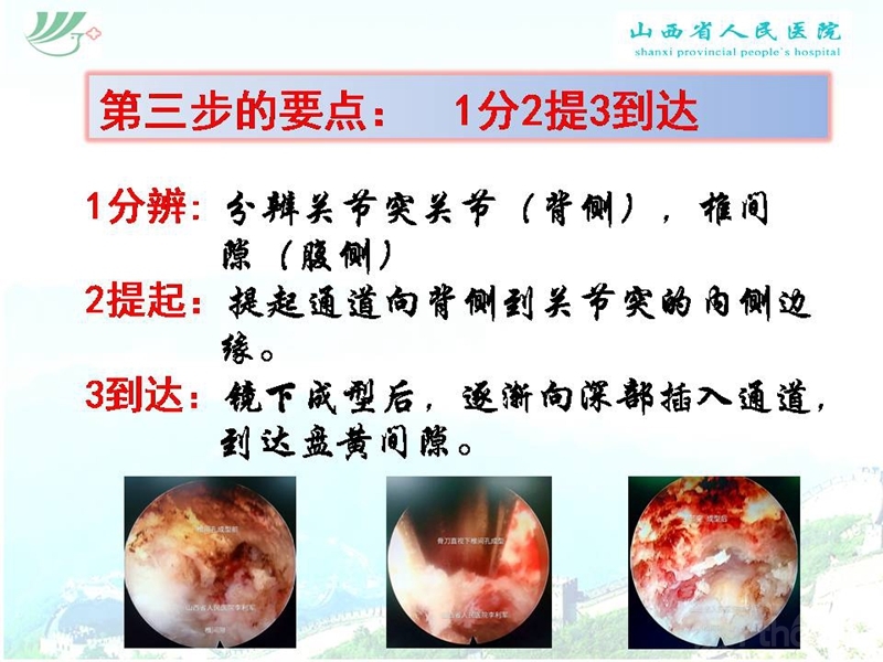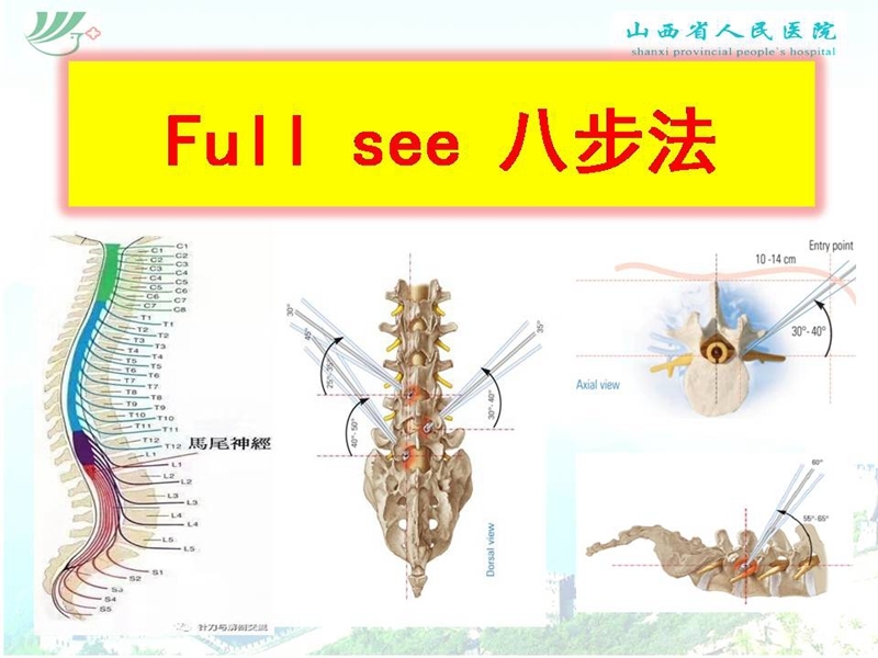 一些可视系统也做了很好的直视下成型的改进和创新,在使用中仍然存在一些不足,如何利用开放的操作方法和内镜技术很好的结合,在内镜直视下完成椎间孔的成型过程,有效的减少神经损伤的风险是脊柱外科医生追究的目的,山西省人民医院骨科李利军主任根据自己的理解和孔镜技术操作改进,提出一种全内镜下完成椎间孔成型,逐步向椎管内推进,根据减压的靶点,完成神经全程减压的技术,即“Full see(Full spinal endoscopic technique)八步法”,现就相关内容作如下介绍。