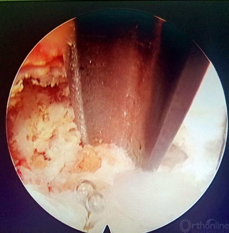 第三步:置入内镜系统,逐步旋转通道,找到上关节突和上下椎体后缘,判断好解剖位置及椎间隙位置,镜下用磨钻或骨刀直视下行椎间孔的成型,根据需要选择性去除部分关节突,达到工作通道逐步推进椎管,看见黄韧带和椎间盘即可(盘黄间隙)。如图3-7