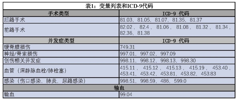 此外,通过ICD-9 CM程序代码筛选出的EOIS患者中,行后路和前路脊柱手术的患者分别列组(表 1)。利用ICD-9 CM程序代码将EOIS患者中行前后路联合手术治疗的患者放在第三组(前后路联合手术)。收集的其他数据有:患者性别、出院诊断(合并症)、住院时间(LOS)、死亡率和住院费用。记录手术相关住院并发症。