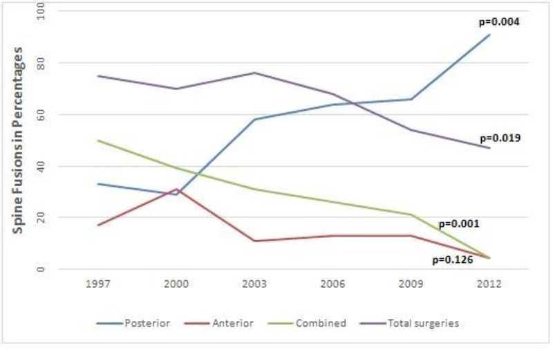 手术方式上,62%(n=342)的患者行后路手术,13%(n=71)的患者行前路手术,24%(n=133)的患者行前后路联合手术。后路手术从1997年的33%显著增加到2012年的91%,(P<0.004)。前后路联合手术从50%降至4.3%(P<0.001)。前路手术也从17%降到4.3%,(P<0.126),但此无统计学意义。
