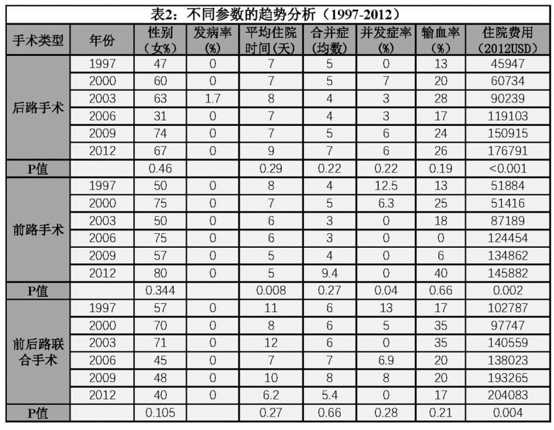 手术队列平均住院时间为8天。后路手术平均为7天,前路手术为6天,前后路联合手术为9天。后路手术的住院时间是相对恒定。前路手术组的住院时间从1997年的8天至2012年的5天,有明显的下降(P>0.008)。在前后路联合手术组中,住院时间长短交替,但总体差异并不显著(P=0.27)。(表 2)