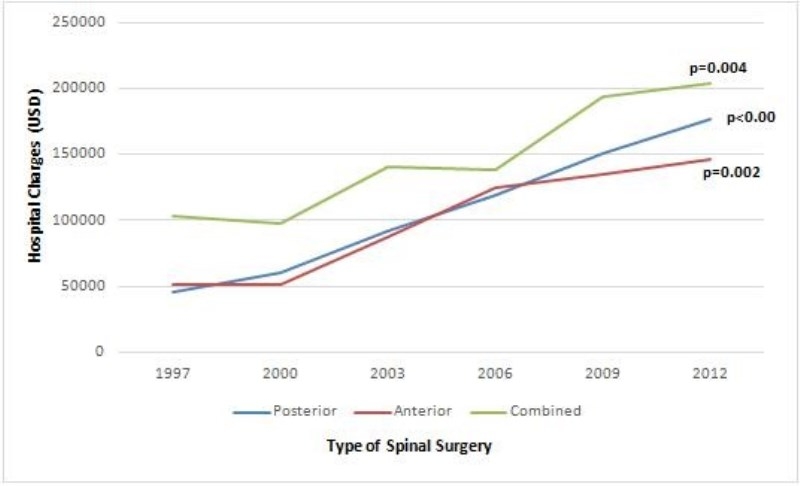 总平均住院费用(成本通胀调整为2012年)是119613美元(表 2),在成本通胀调整为2012年时(图 2),所有类型手术的平均住院费用均有所增加。对于后路手术,1997年的平均成本为45947美元,2012年的176791美元(P<0.001)。对于前路手术,费用增加2.8倍,(P<0.002);而对于前后路联合手术,费用增加了1.98倍,(P<0.004)。