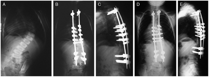 图7 McCarthy等[14]报道了38例行Shilla技术治疗的患者,随访2年以上。A:3岁婴儿特发性脊柱侧凸患儿术前正位X片;B和C为术后3月影像资料;D和E为术后2年正侧位X片